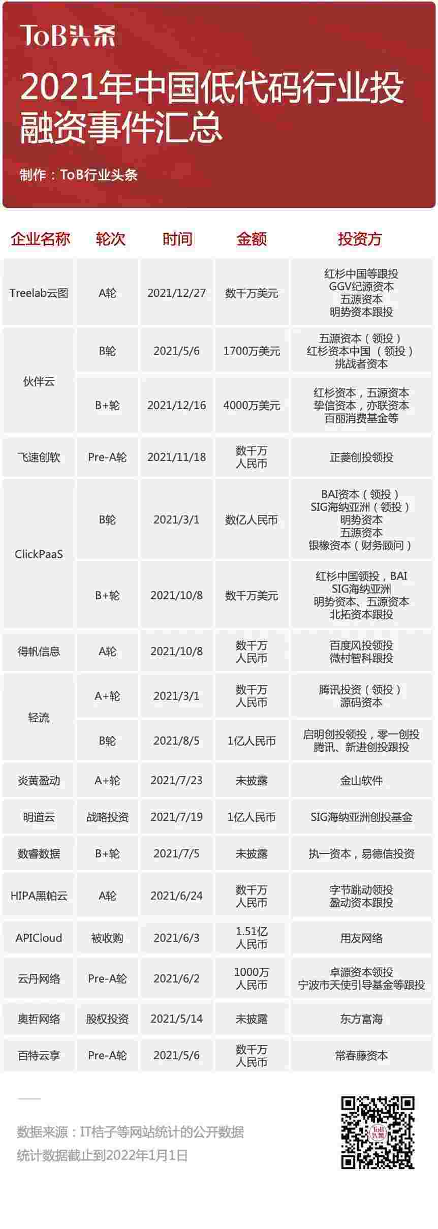 到2021年,,,,无/低代码投融资规模势头更甚,,,其中包括轻流两轮融资(A+轮数千万人民币,,,,B轮近亿人民币)、、、、VIVO钱包 两轮融资(B轮数亿人民币,,,,B+轮数千万美元)、、、百特云享数千万元Pre-A轮融资......