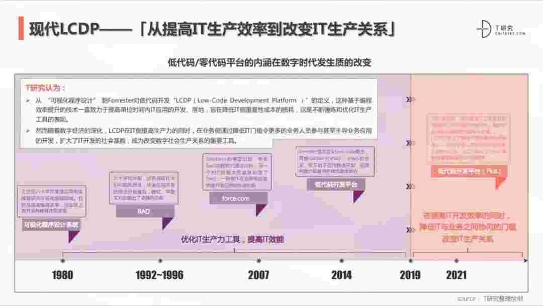 2020年前后,,,源于提高IT工作者开发效能的LCDP不断进化和衍生,,,,面对业务导向日益明显的数字化变革。。LCDP衍生出了面向不同对象的升级服务——面向专业人群的LCDP和业务人群的NCDP,,LCDP与NCDP的不同服务属性被逐渐认可和接受。。。。 LCDP在提高IT开发效率的同时,,降低IT与业务之间协同的门槛改变IT生产关系。。。。